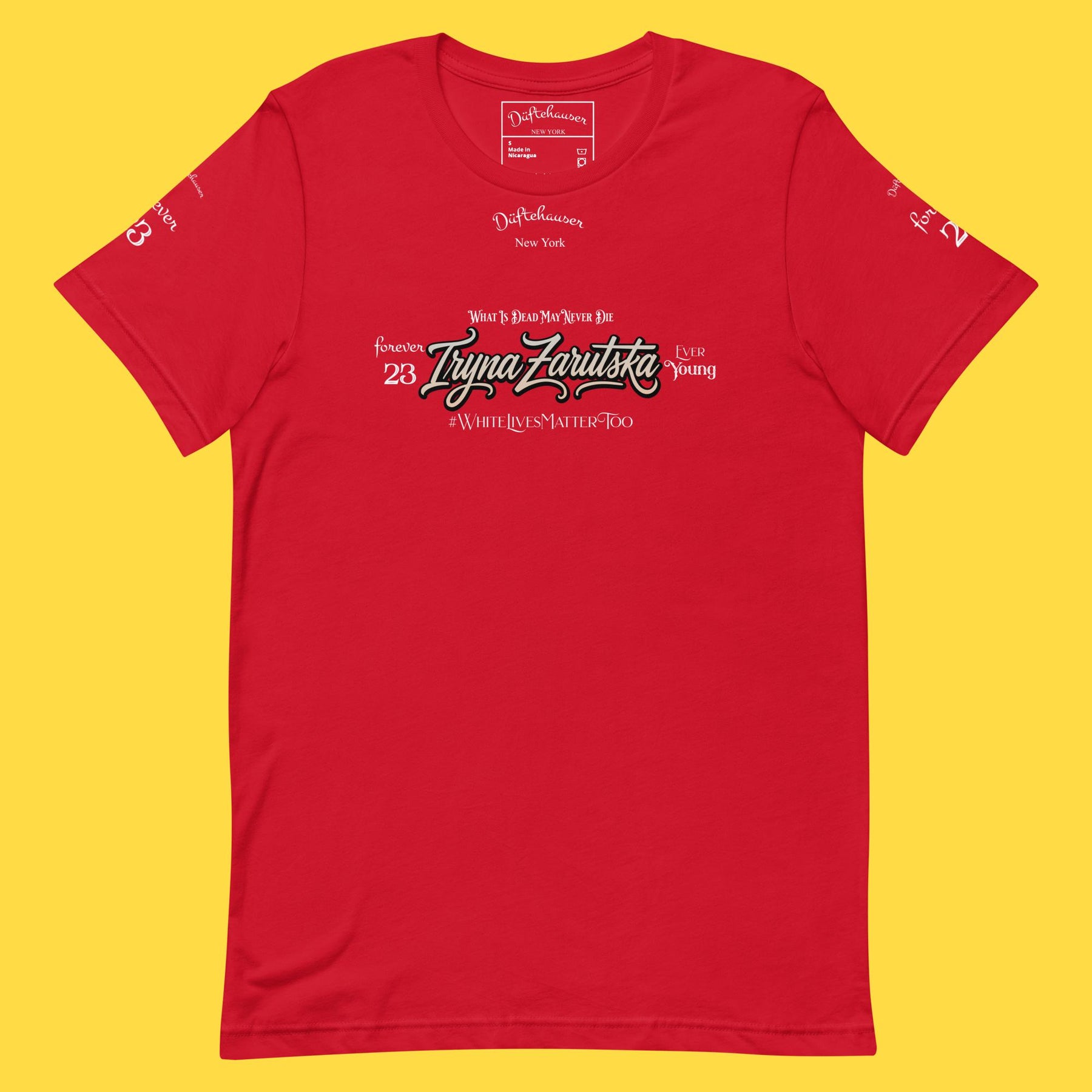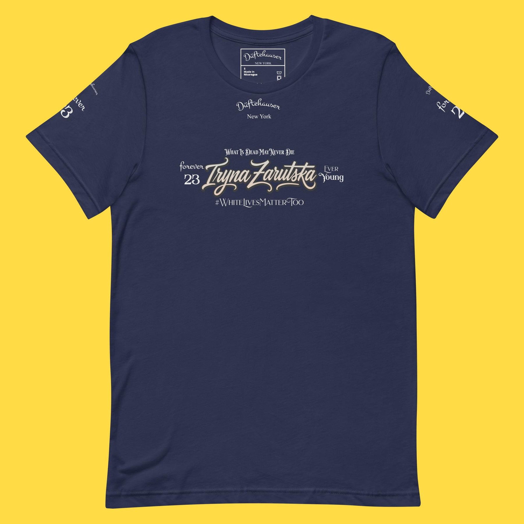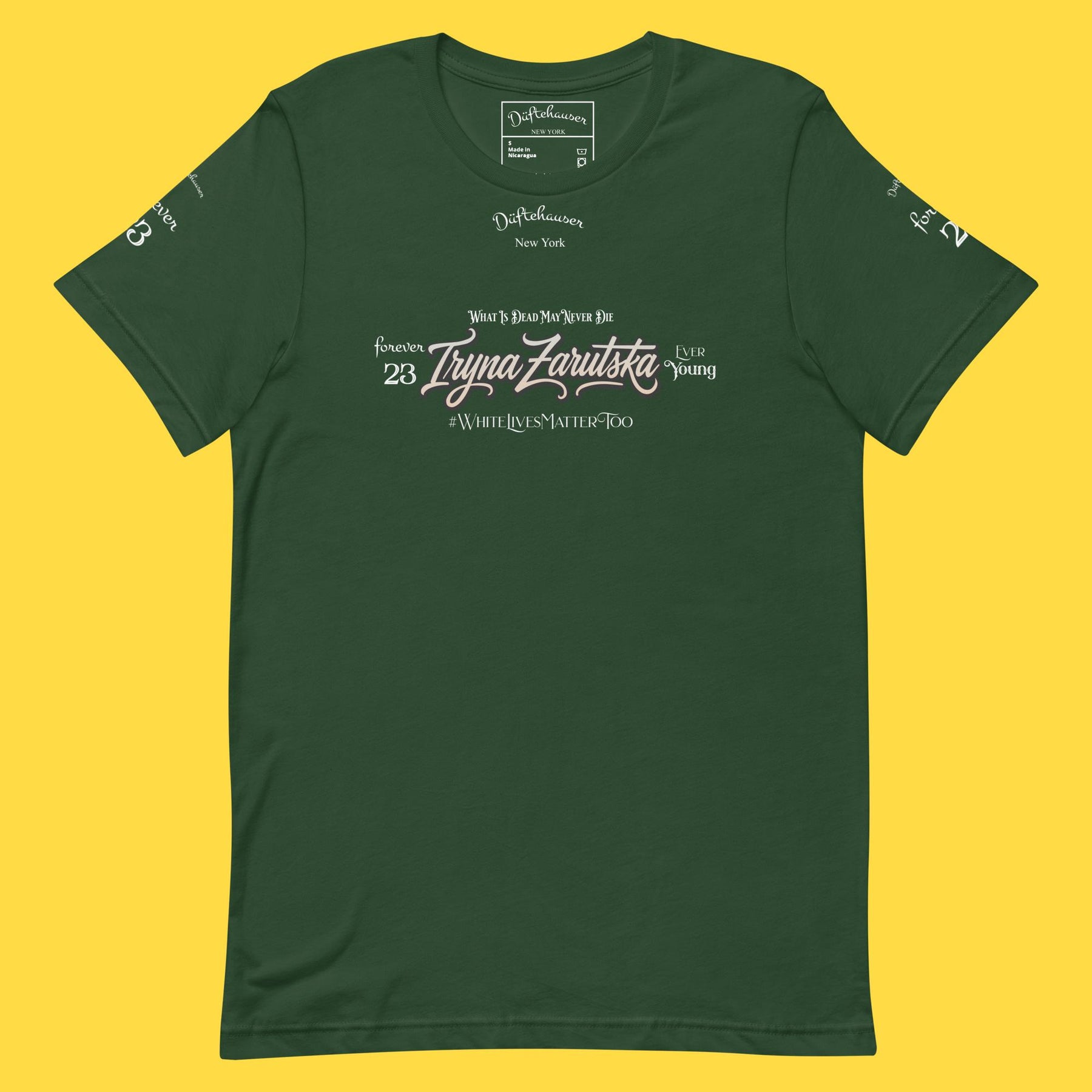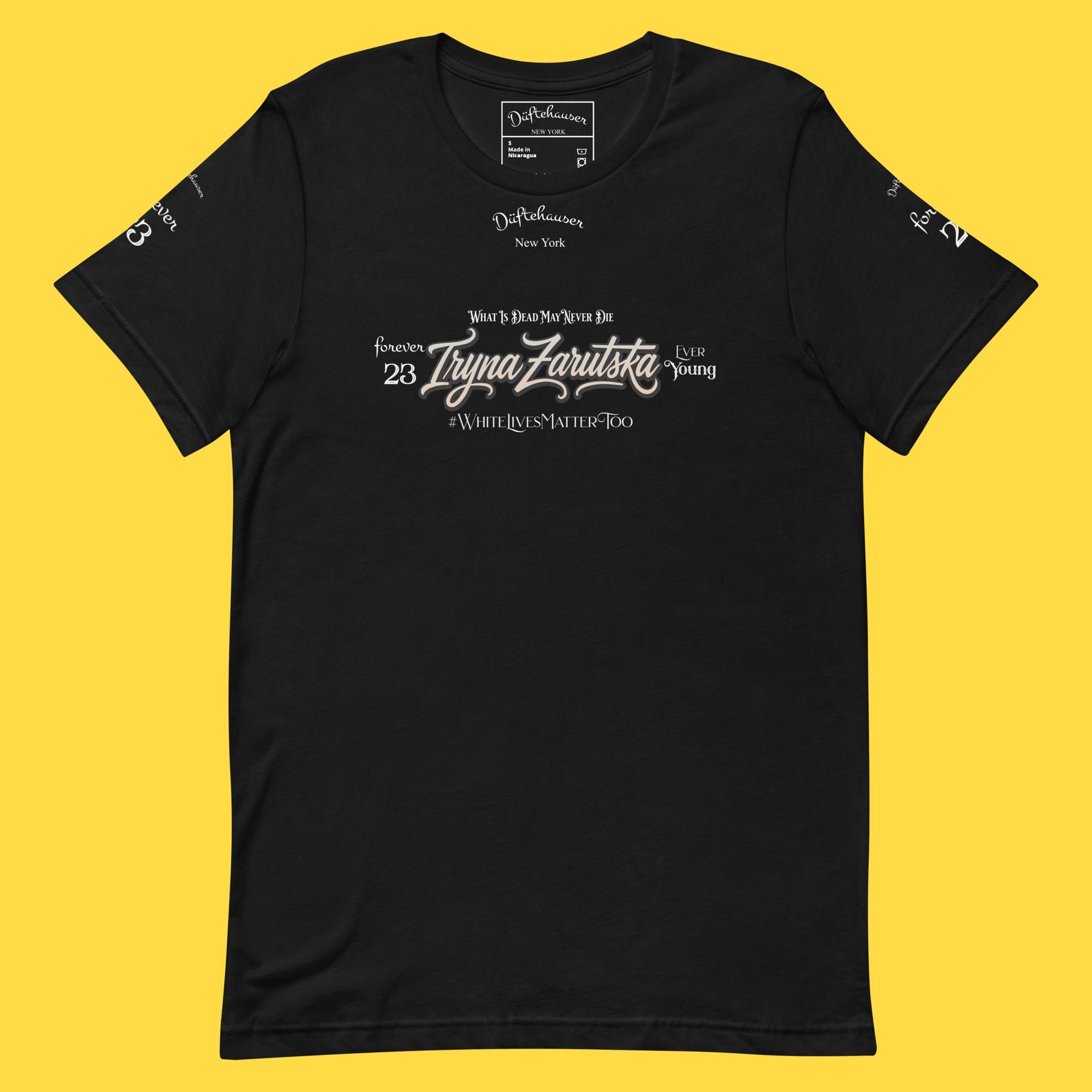 This t-shirt was made in honor of a beautiful young woman that came to the United States to escape war and lost her life in a senseless act of brutality. It is the position of the Duftehauser brand that as long as the company remains solvent we will do whatever we can to make her memory live on. And so it is with this mission that we created these T shirts bearing her name. To commemorate a beautiful young life that was stolen and to give everyone that was similarly touched by her story a chance to remember her and to keep her memory alive in the minds of everyone that reads the text on the garments. What is dead may never die.